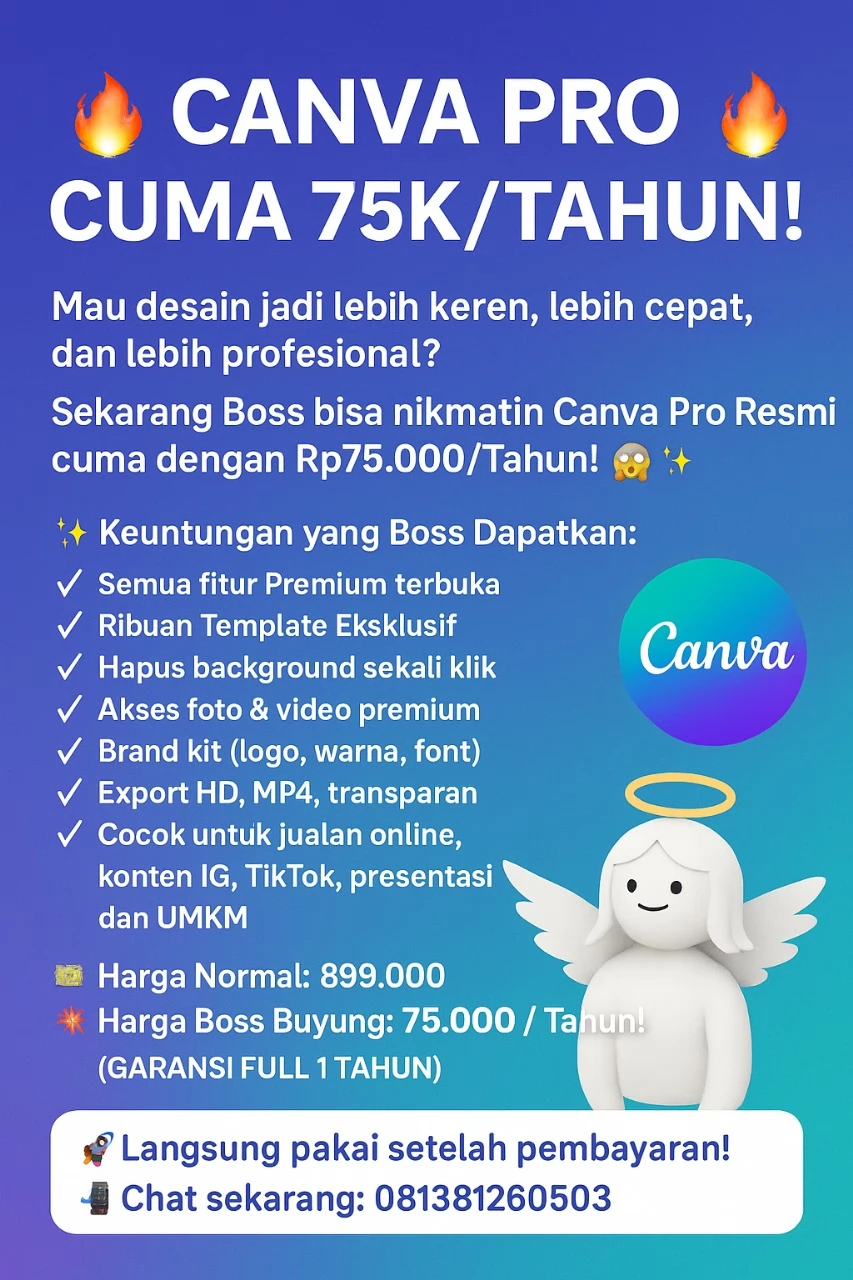 Butuh Canva Pro Murah & Mudah Anti Ribet Untuk Desain Marketing Depok? Kami menyediakan layanan aktivasi Canva Pro yang aman, cepat, dan siap membantu pelaku UMKM, kreator konten, admin sosial media, hingga tim marketing yang membutuhkan desain profesional tanpa skill desain yang rumit. Dengan Canva Pro, Anda dapat membuat materi promosi, poster, feed Instagram, banner produk, katalog, hingga konten iklan dengan jauh lebih praktis.
