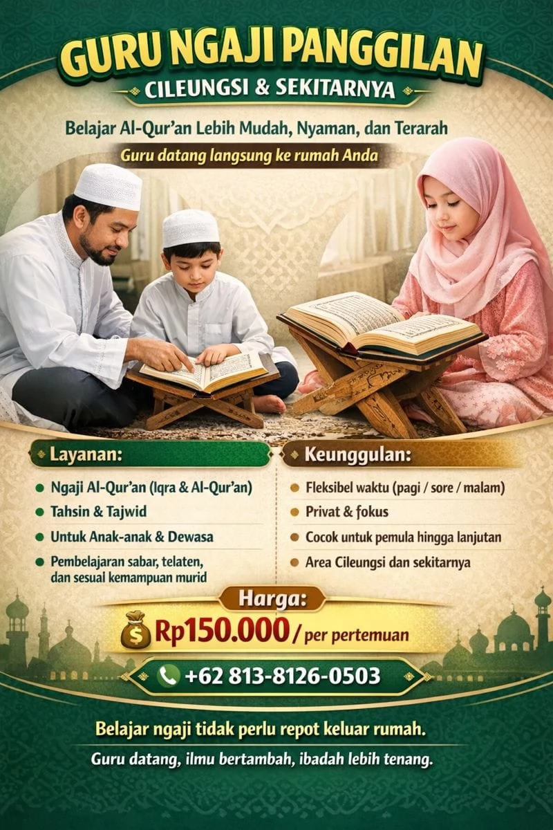 Jika Anda sedang mencari Guru Ngaji Panggilan Cileungsi Berpengalaman Datang Langsung ke Rumah dengan sistem belajar privat, nyaman, dan terarah, sekarang adalah waktu yang tepat untuk memulai.
